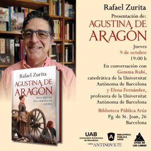 El pròxim dijous, 9 d’octubre a les 19.00 h es presentarà a la Biblioteca Pública Arús el llibre Agustina de Aragón. Vida y mito de una heroína de guerra, a càrrec de Rafael Zurita, l’autor, i de Gemma Rubí i Elena Fernández, historiadores.