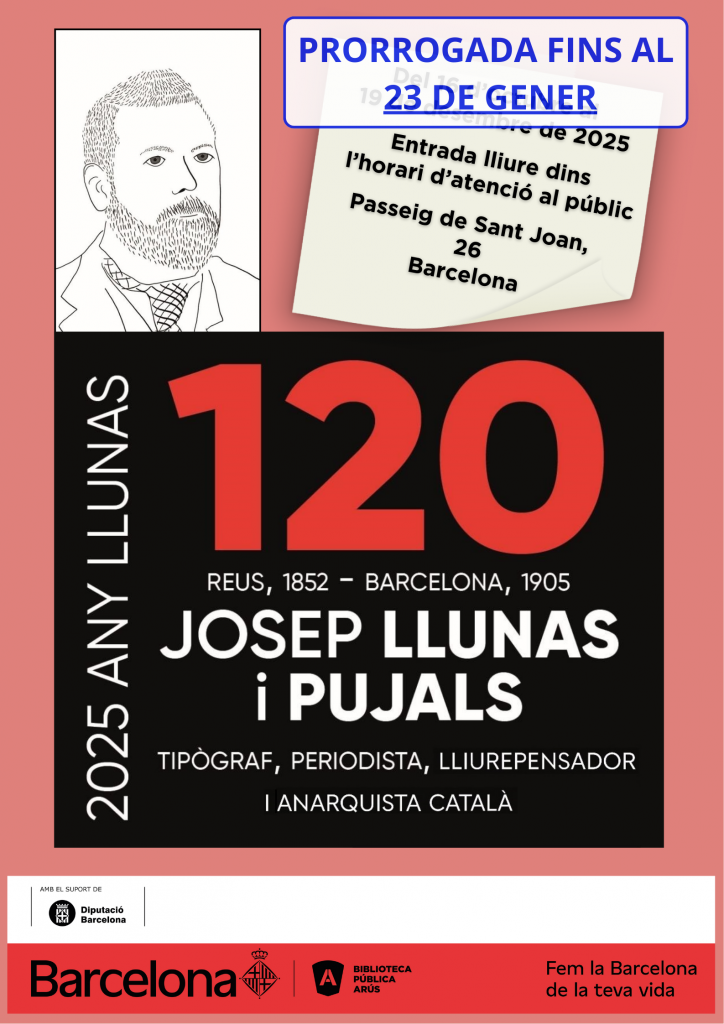 Amb motiu del 120è aniversari de la mort de Josep Llunas i Pujals (Reus, 30/01/1852 – Barcelona, 23/05/1905), la Biblioteca Arús se suma a la commemoració de l’Any Llunas 2025. Per reconèixer i donar difusió a la figura d’aquest destacat tipògraf, periodista, poeta, lliurepensador i anarquista català del segle XIX, s’ha organitzat una exposició amb documents, periòdics, revistes, imatges i bibliografia pròpia i sobre la seva vida i obra.
