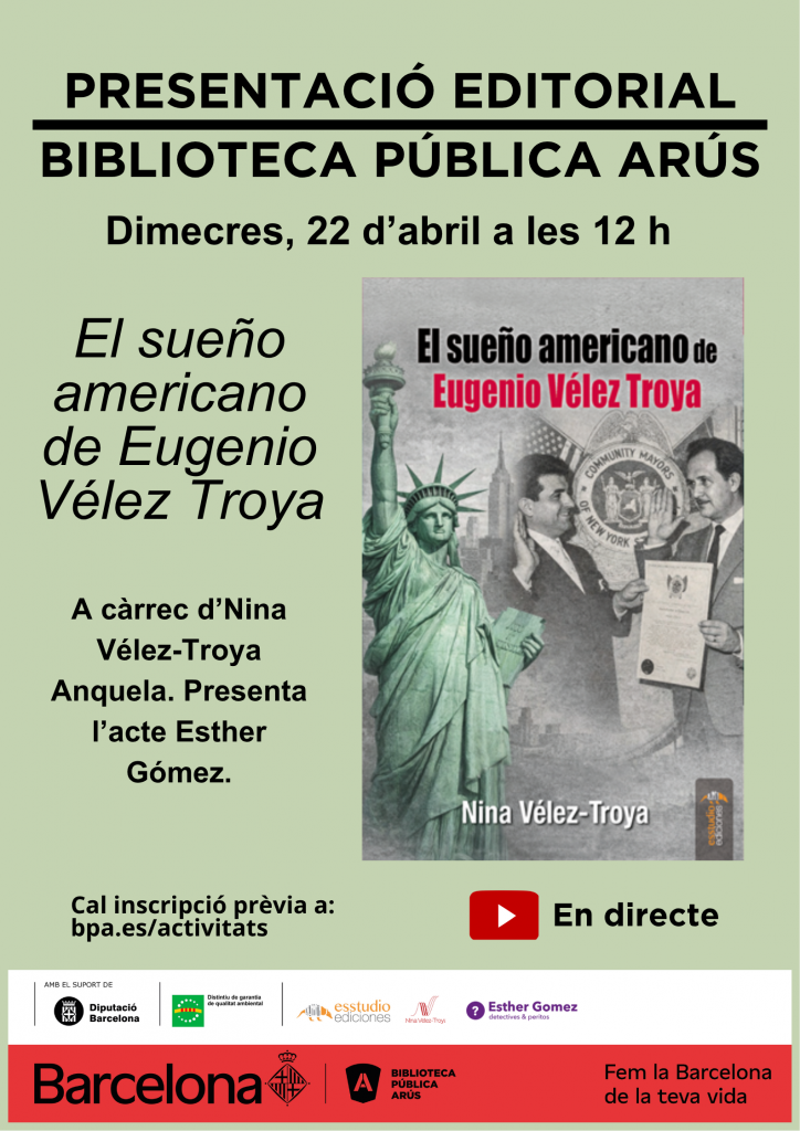 El pròxim dimecres, 22 d’abril a les 12 h es presentarà a la Biblioteca Arús el llibre «El sueño americano de Eugenio Vélez Troya». A càrrec d’Nina Vélez-Troya Anquela. Presenta l’acte Esther Gómez.